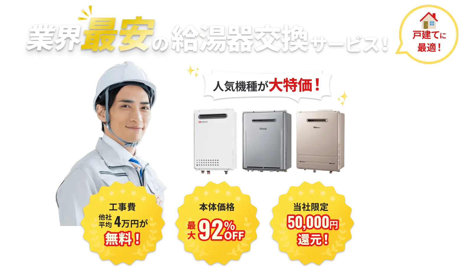 ※キャッシュバック内容の詳細:給湯器の交換を申し込む際にプロパンガスと電気も一緒にお申し込みいただくと、最大で合算5万円のキャッシュバック(ギフト券)を実施いたします。(内訳:プロパンガス 4万円 / 電気5千円 / 都市ガス5千円)